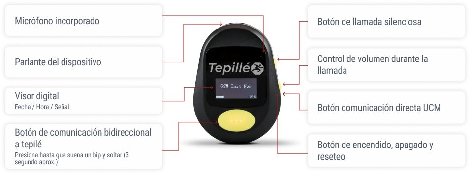 Este dispositivo cuenta con un parlante/micrófono que permite, con sólo describir su Emergencia, alertar a nuestros operadores.